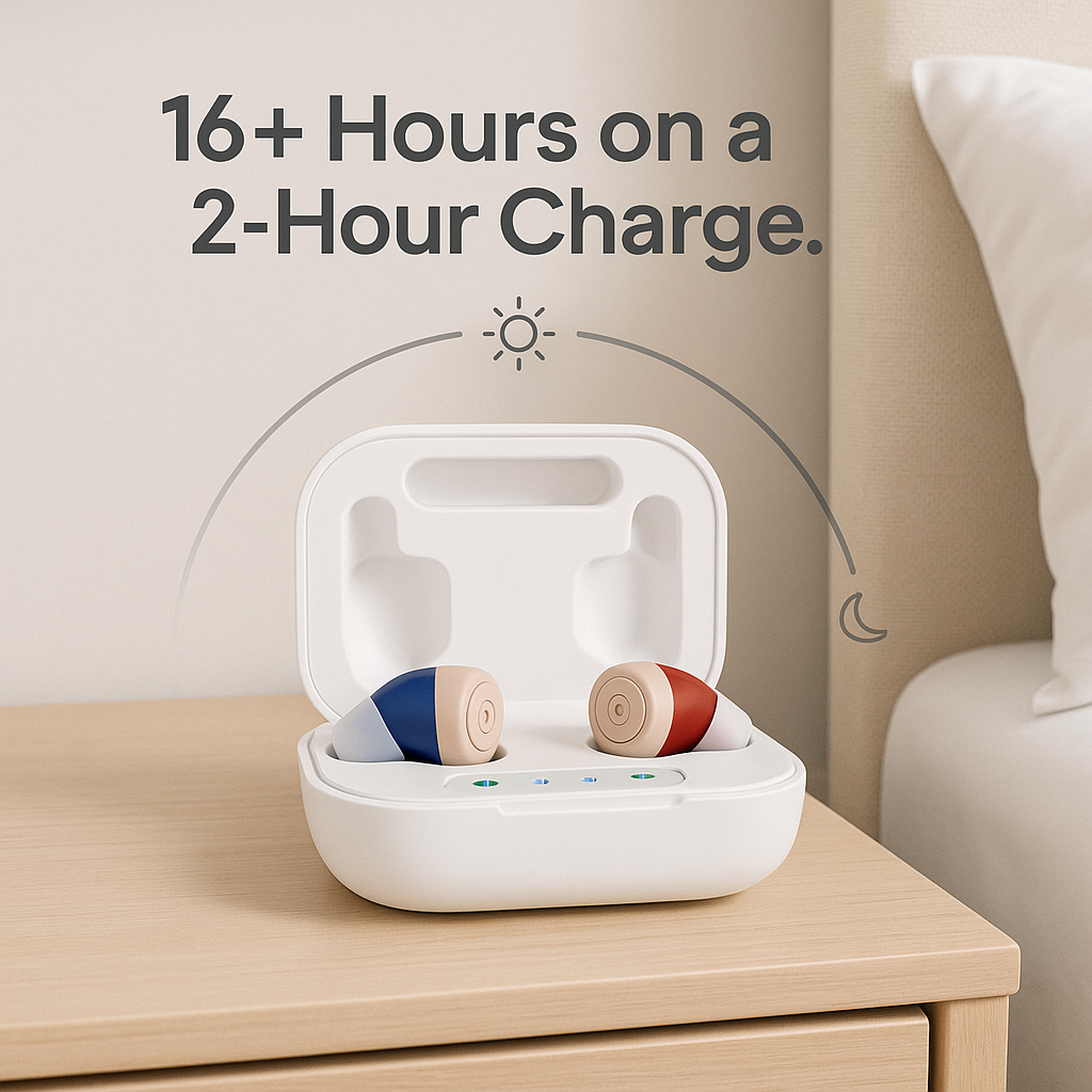 About 2 hours to full gives roughly 16+ hours of typical use. Return them to the case for safe storage and auto power-down. Wipe tips daily and keep charging contacts clean for reliable top-ups.