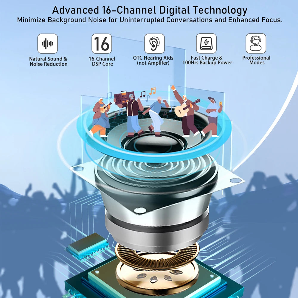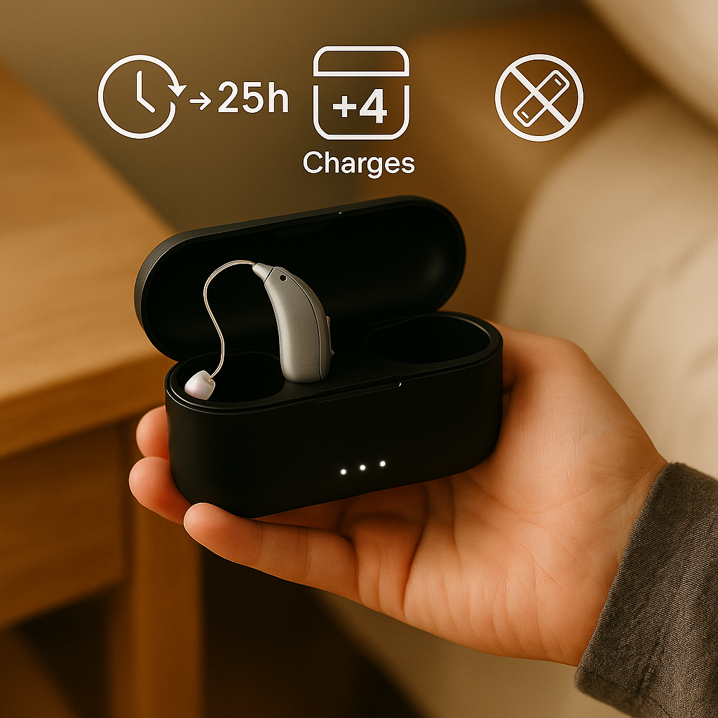 Light behind-the-ear fit with soft domes—comfortable through a full workday. The 16-channel DSP keeps voices crisp on calls and in meetings. The charging case is straightforward and the LEDs are helpful.